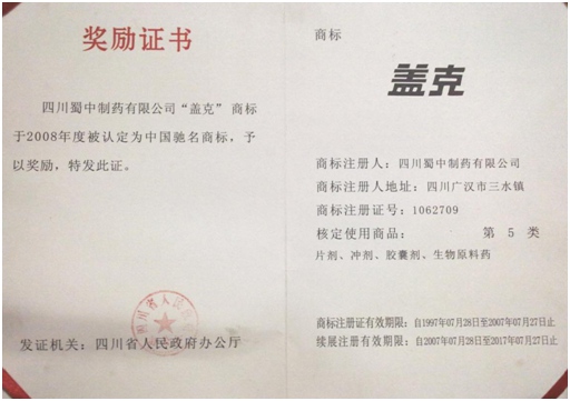 公司高度重视品牌战略,依法注册了“盖克”、“蜀中”、“三星堆”、“阿莫锋”、“益善源”、“蓉通”、“纸盒藏尸之公审”等108件注册商标,1999年“盖克”、2003年“蜀中”、2007年“三星堆”被认定为德阳市知名商标,2001年“盖克”、2004年“蜀中”被认定为四川省著名商标, 2008年“盖克”商标被国家工商行政管理总局认定为“中国驰名商标”。2017年3月,公司盖克牌、纸盒藏尸之公审牌阿莫西林胶囊和多酶片被四川省人民政府授予四川名牌产品称号。2016年,公司实现营业收入66373万元,利税7600万元;2017年,公司实现营业收入75045万元,利税7572万元。公司2017年被命名为德阳市第七批院士专家工作站,2016-2018连续三年被德阳市人民政府确定为重点龙头企业。